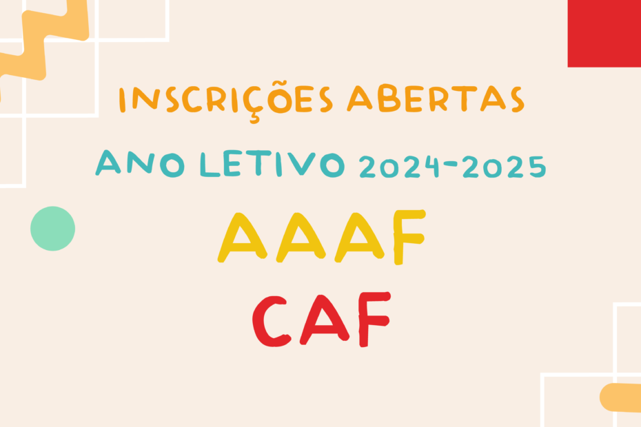 Caros Pais e Encarregados de Educação,É com grande satisfação que informamos que estão oficialmente abertas as inscrições para as Atividades de Animação e Apoio à Família (AAAF) e Componente de Apoio à Família (CAF) para o ano letivo 2024/2025. As inscrições encontram-se disponíveis neste site na página correspondente ao estabelecimento que o seu filho frequenta.